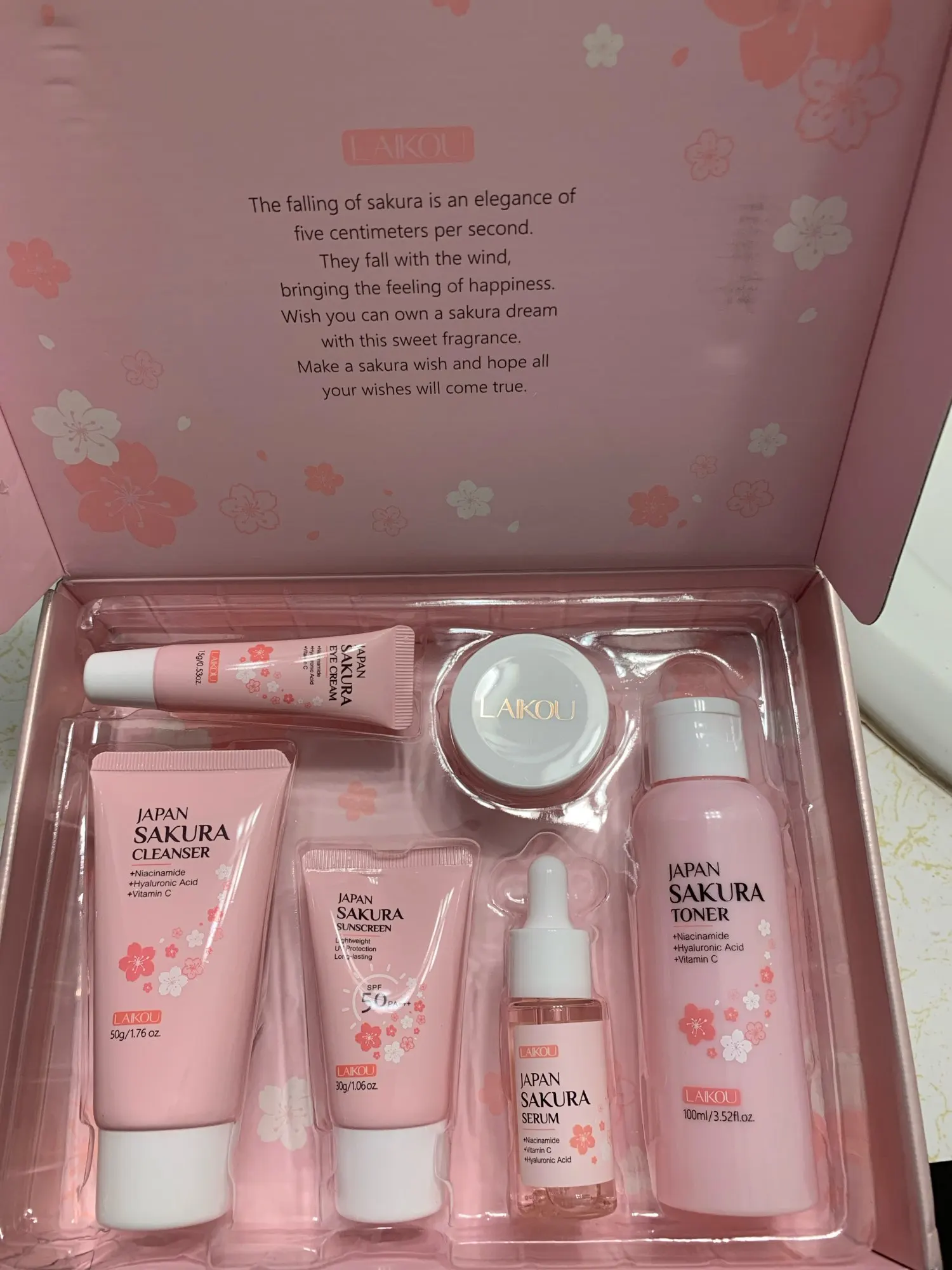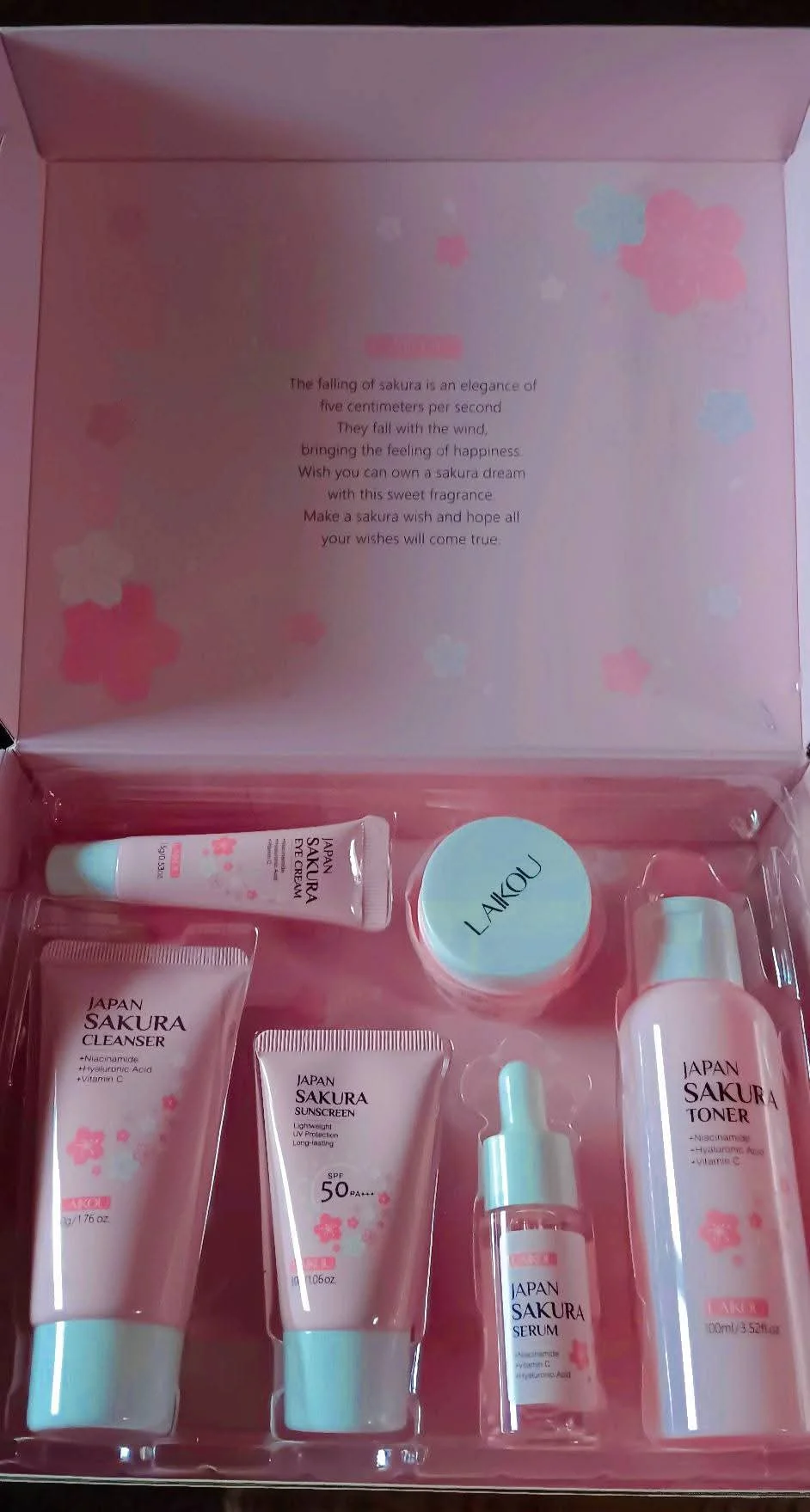 Pamper your skin with the Sakura 6-Piece Skin Care Set. This all-in-one set features serum, face cream, toner, cleanser, sunscreen, and eye cream to hydrate, brighten, and promote healthier-looking skin. Ideal for daily use or as a thoughtful gift, it helps improve skin texture, leaving your complexion refreshed, smooth, and radiant.